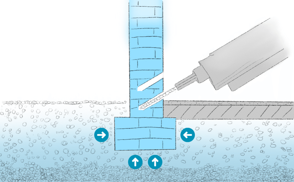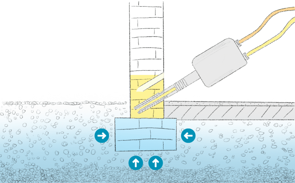 Das Mauerwerk muss in dem betroffenen Bereich vollständig ausgetrocknet werden. Wir fügen also Bohrkanäle in das feuchte Mauerwerk ein.
